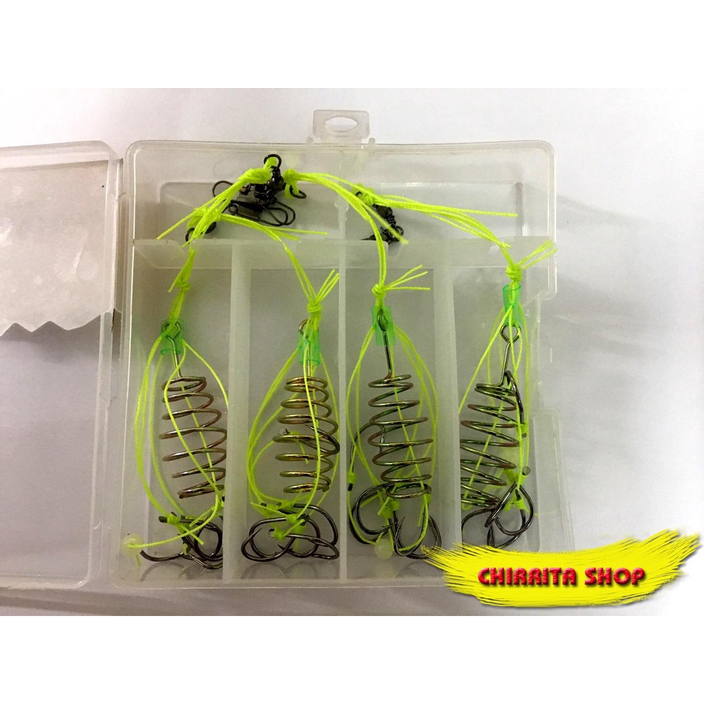 Hộp 04 bộ lưỡi câu lăng xêBộ lưỡi câu lăng xê một hộp gồm 4 bộ cho các cần thủ sử dụng được nhiều lần, Lâu dài hoặc1 lúc câu nhiều cần. Một bộ gồmlò xo và 6 lưỡi câu sắc bén làm từ thép không gỉ sét Dây PE chắc chắn. Sản phẩm có nhiều size số lưỡi câu khác nhau từ số 6 đến số 12 cho bạn lựa chọn để câu phù hợp .