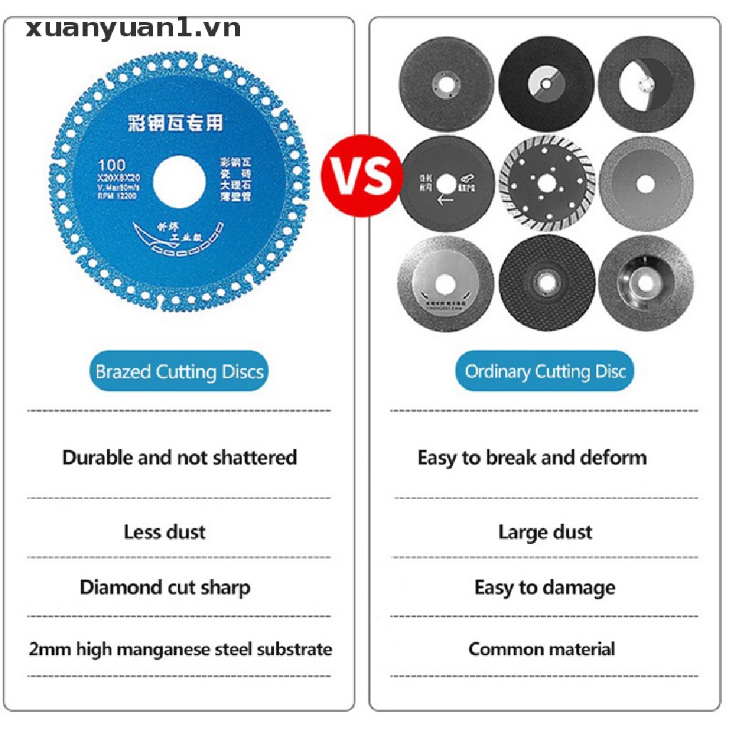 Mô tả sản phẩm: Cắt nhanh và chính xác Lưỡi cắt kim cương có thể chống lại nhiệt độ cao, giảm độ rung và cắt thẳng và nhanh hơn. Nó sắc nét và sẽ không bị sụp. Đa năng, rạch nhỏ, chống cắt và mài mòn. Phạm vi áp dụng: Được sử dụng cho tấm đá mài, đá cẩm thạch, hợp kim nhôm, nhôm, ống PVC, v.v. Chip cắt miễn phí Lưỡi dao siêu mỏng 1mm không làm hỏng bề mặt vật thể, với lực mài đồng đều và độ phẳng tốt. Tiếng ồn mài thấp, ít bụi hơn, ít mảnh vụn hơn, cắt lớp đầu tiên! Dễ sử dụng Được thiết kế cho máy mài góc 100, dễ dàng lắp đặt và sử dụng, có thể chịu được các yêu cầu của dao cắt khô / ướt và vết cắt liên tục lâu dài. Vật liệu nâng cao Nó sử dụng ma trận thép mangan cao kim cương, quy trình hàn mới và nâng cấp và cải tiến lưỡi dao, thuận tiện hơn, an toàn hơn và có tuổi thọ lâu hơn. Thông tin chi tiết: Tên sản phẩm: mảnh cắt đa năng composite Chất liệu sản phẩm: thép mangan cao Kích thước: Đường kính 10cm / 3,93 inch