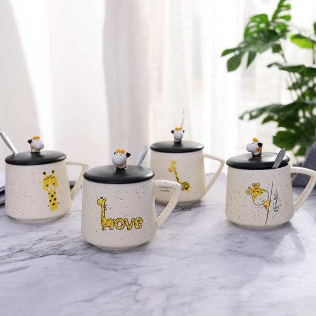 Giới thiệu Ly Cốc Sứ Hươu Cao Cổ 401-500ML Xinh Xắn - Ly Có Nắp Và Thìa Inox