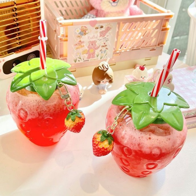 Chiếc cốc dâu tây này trông rất dễ thương, có ống hút tiện lợi, dung tích lớn, trang trí hình quả dâu tây thêm phần thú vị.