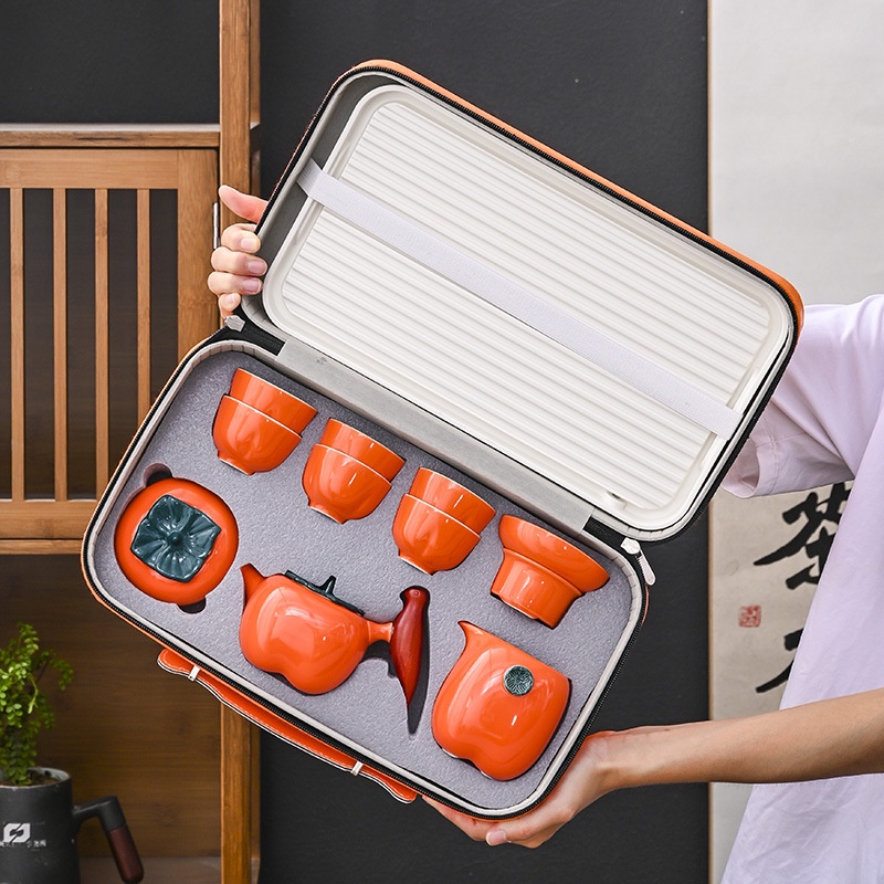 Bộ Ấm Chén Sứ Pha Trà Đạo Độc Đáo Hình Quả Hồng Kèm Vali Sang Trọng