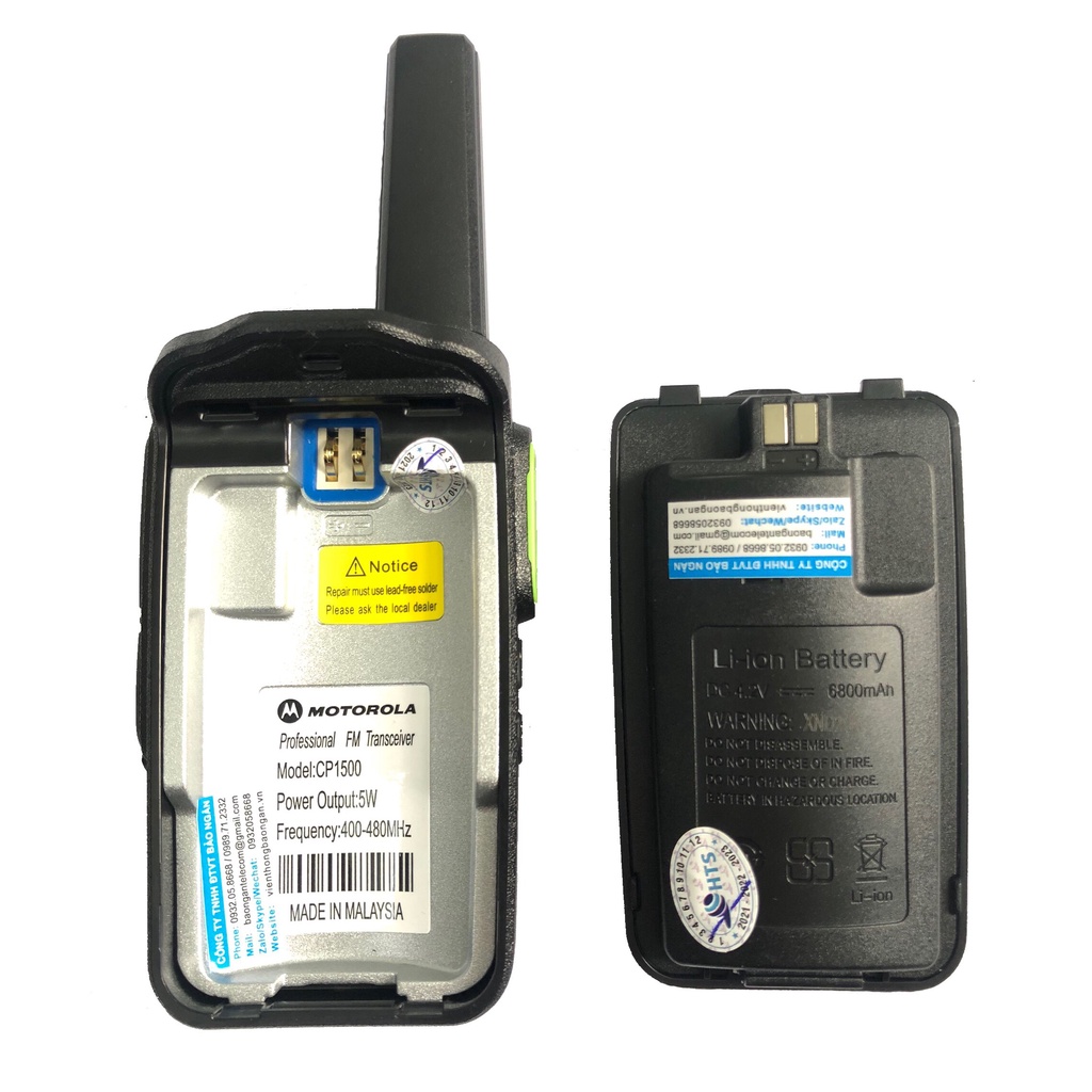 QUÝ KHÁCH CÓ BẤT CỨ CÂU HỎI HỔ TRỢ LIÊN HỆ HOTLINE: 0932.05.8668. Chúng tôi cung cấp bộ đàm với giá rẻ khắp toàn quốc. Small Walkie Talkies Moto CP1500 2Way Charger for hotel restaurant beauty salon Specification Bộ đàm Moto CP1500, Bảo Hành 12 tháng, Loa Siêu To, 2 Chế độ sạc(Sạc để bàn và sạc cổng Type-C sạc được trên oto, laptop, sạc dự phòng...) Sạc pin theo máy và Pin dự phòng cùng lúc, có thể Sạc được riêng pin phù hợp với các KH có nhu cầu sử dụng thêm pin Dự phòng để thay thế khi pin hết., sử dụng >18h, Pin chờ 10 ngày