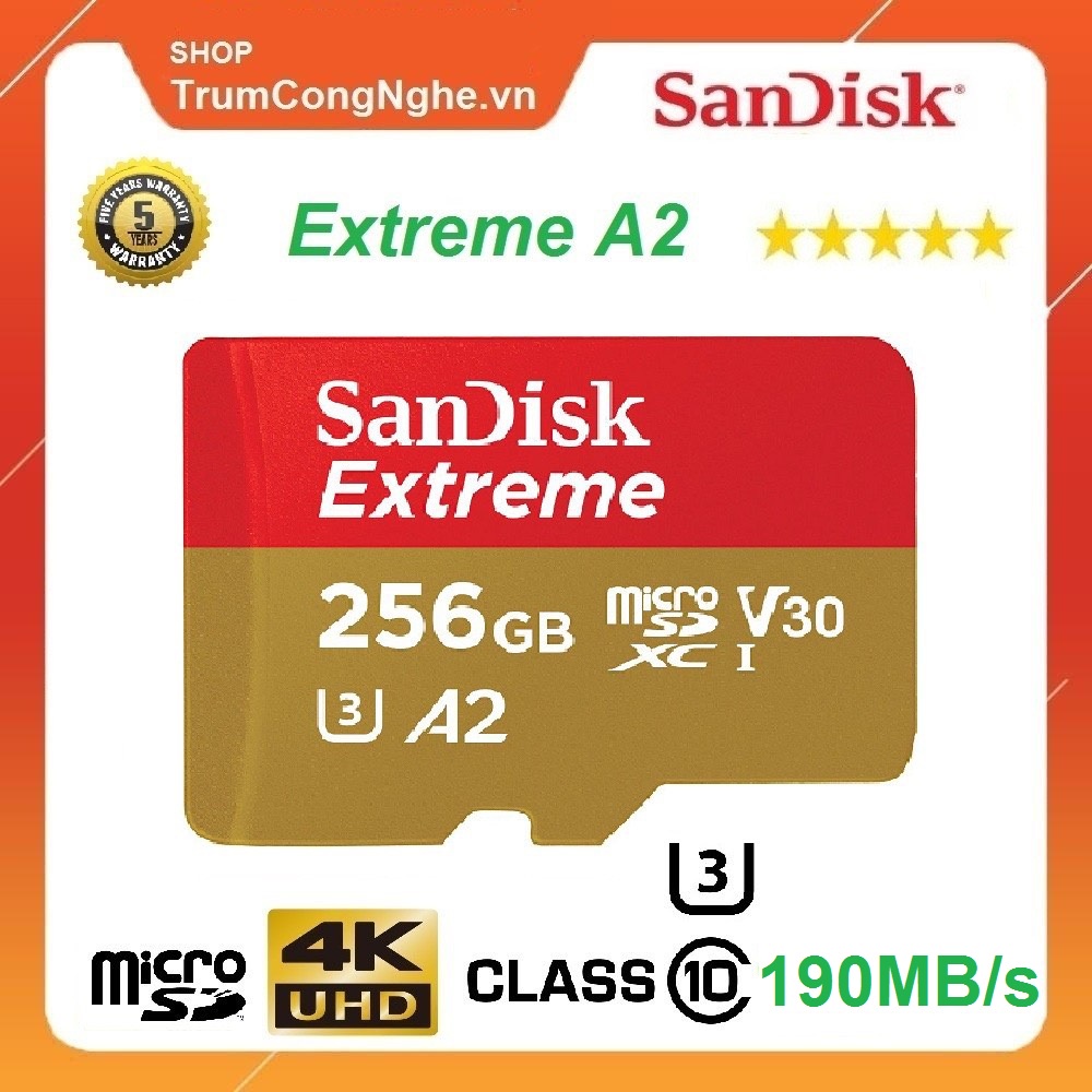 Nhà sản xuất Sandisk (USA) Model Extreme A2 Chuẩn giao tiếp MicroSDXC Dung lượng 256 GB Tốc độ đọc 190 MB/s Tốc độ ghi 130 MB/s