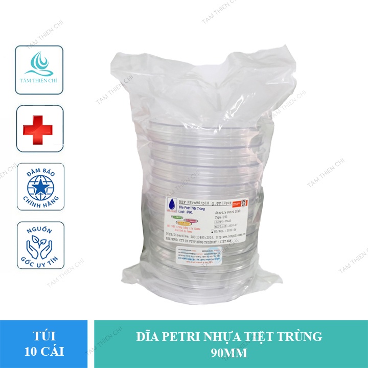 Đĩa Petri nhựa do hãng Hồng Thiện Mỹ sản xuất theo dây chuyền hiện đại, quy trình sản xuất đáp ứng theo tiêu chuẩn ISO 13485, sản phẩm được Bộ Y Tế cấp phép lưu hành. - Nhận dạng: Nhựa PS trắng trong, đường kính 90mm, chiều cao 1.5mm - Thành phần: nhựa trung tính, tinh khiết 100%. - Tiệt trùng: Vô trùng bằng tia gamma. - Công dụng: Dùng chứa môi trường nuôi cấy vi sinh vật. Dùng trong điều kiện vô trùng. - Đóng gói: túi 10 cái đã qua tiệt trùng - Tiêu chuẩn: ISO 13485 - Xuất xứ: HTM/ Việt Nam