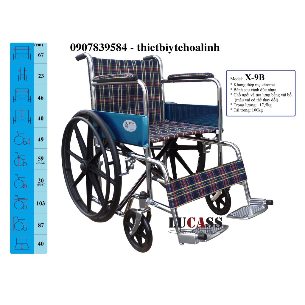 SHOP SHIP NHANH TRONG KHU VỰC TP.HCM Thông số kỹ thuật: - Xe có gắn 2 vòng lăn hai bên, giúp cho việc tự di chuyển - Có hai tay đẩy phía sau để có người nhà giúp di chuyển dễ dàng. - Độ rộng ghế ngồi: 46cm - Khung xe được làm bằng sắt mạ crôm - Ghế bằng chất liệu da simili màu đen - Bô vệ sinh bằng nhựa cao cấp, có thể tháo lắp dễ dàng. Khi cần đi vệ sinh thì kéo miếng ở giữa chỗ ngồi ra Tấm đặt chân bằng nhôm đúc hợp kim hoặc bằng nhựa - Bánh trước rộng 8″, xoay 360o - Bánh sau 24", bánh đặc, không phải bơm hơi - Vành xe nan hoa tải trọng 120 kg - Có thể gập lại gọn gàng tiện cho việc di chuyển - Sản phẩm đạt các chứng chỉ: FDA của Mỹ, TUV, ISO 9001, ISO 13485 : 2003 Bảo hành khung xe 6 tháng Trọng lượng: 20,4kg, cả hộp 22,4kg Kích thước hộp: 92 x 30 x 87 cm