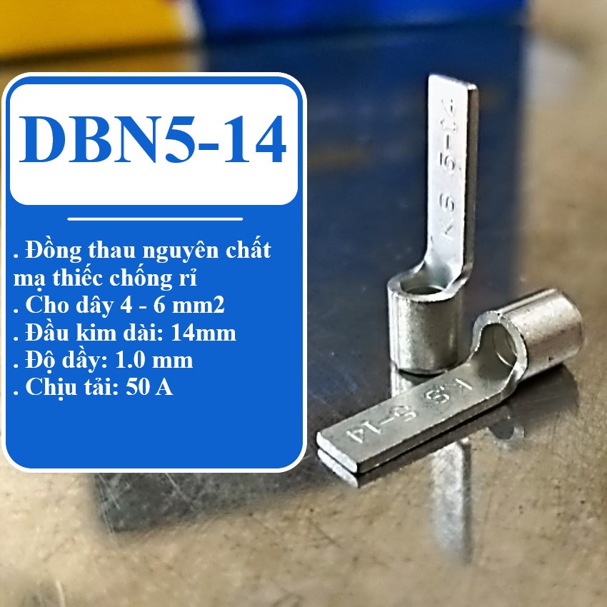 🔷 DBNB2-10: . Dùng cho dây điện có tiết diện từ 1.5mm2 đến 2.5mm2 ( 22-16 AVG ) . Độ dầy: 0.75mm . Chịu tải: 18A . Đầu kim dài: 10mm 🔷 DBNB5-14: . Dùng cho dây điện có tiết diện từ 1.5mm2 đến 2.5mm2 ( 16-14 AVG ) . Độ dầy: 1.0mm . Chịu tải: 50A . Đầu kim dài: 14mm