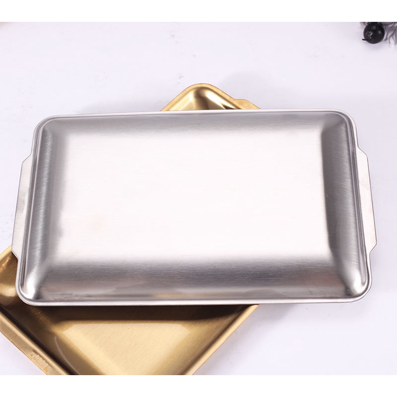Chất liệu: inox màu sắc: bạc, vàng đồng Hình dạng: chữ nhật Đĩa inox có thiết kế cổ điển, màu sắc sang trọng thích hợp để đựng thịt nướng, thức ăn bày biện bàn tiệc, hoặc dùng làm khay phục vụ bàn trà cà phê, bánh ngọt ở quán trà, nhà hàng ẩm thực, hoặc đựng filler botox, dụng cụ y tế ở spa, thẩm mỹ viện