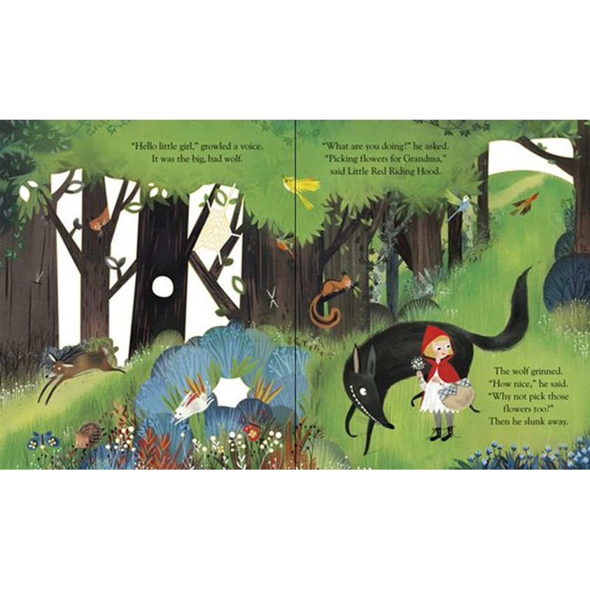 GIỚI THIỆU SÁCH Peep Inside A Fairy Tale: Little Red Riding Hood là một phiên bản nâng cấp được minh họa đầy lôi cuốn của câu truyện cổ tích quen thuộc. Các bạn nhỏ có thể nhìn xuyên qua những cái lỗ trên trang giấy để nhìn thấu cánh rừng u tối, và lật xem dưới tán cây kia Sói Lớn xấu xa có đang rình mò Cô bé quàng khăn đỏ không?