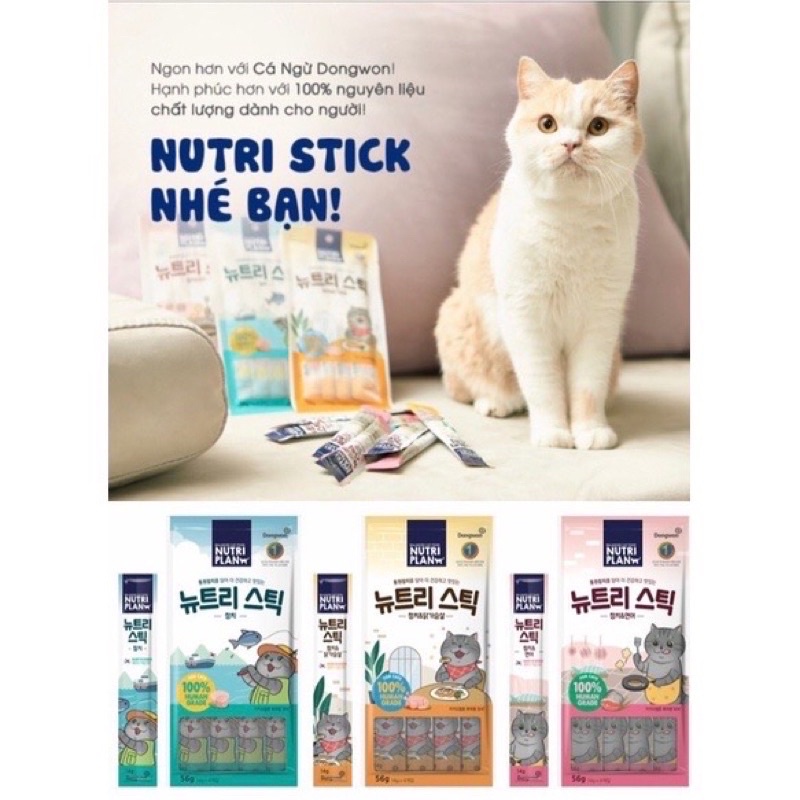 Nutri Stick là dòng sản phẩm Dongwon sử dụng nguyên liệu SỬ DỤNG CHO NGƯỜI để sản xuất, giúp mèo được thưởng thức những món ngon lành mạnh và tốt cho sức khỏe.