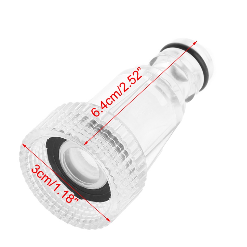 • Loại sản phẩm: đầu nối lọc nước máy rửa xe hơi. • Chất liệu: nhựa. • Chiều cao: 6.4cm/ 2.52”. • Đường kính: 3cm/ 1.18”. • Màu sắc: Trong suốt. • Áp suất tối đa: 175PSI. • Nhiệt độ tối đa: 140o.