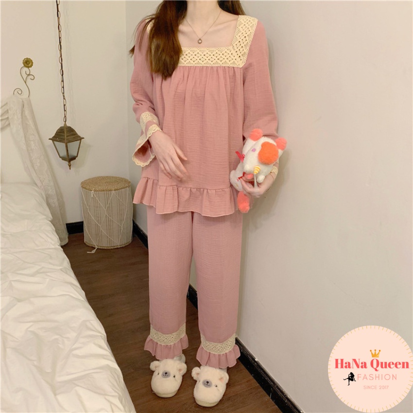 Giới thiệu Bộ đồ mặc nhà dài tay phối ren chất muslin cao cấp phong cách tiểu thư cực xinh [Hàng Có Sẵn]