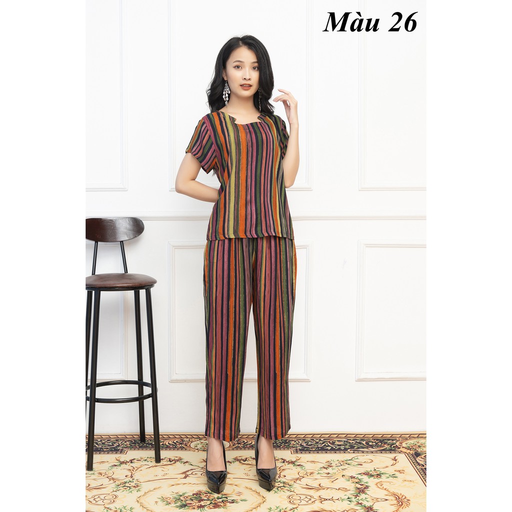Bộ mặc nhà lanh Vicci áo cộc tay phối quần dài in họa tiết được may từ chất liệu vải lanh nhung nhẹ, bề mặt vải mềm mịn, phù hợp mặc trong mùa xuân hè. Sản phẩm với thiết kế đơn giản cùng họa tiết nổi bật mang lại nét gọn gàng, duyên dáng cho phái đẹp. • Chất liệu: Vải lanh, tole nhung • Áo suông, tay ngắn • Quần dài lưng thun • Xuất xứ: Việt Nam Size: M, L, XL,XXL, XXXL (từ 45-75kg).Tùy theo chiều cao/cân nặng mà KH có thể tiến/lùi một size.