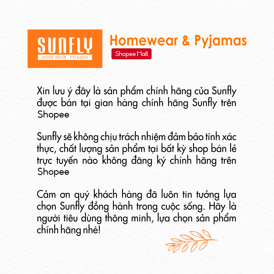 VỀ THƯƠNG HIỆU SUNFLY Sunfly được ra đời với sứ mệnh mang lại vẻ đẹp tươi trẻ,tự tin và năng động cho các chị em phụ nữ VN trong những giờ phút bên gia đình và người thân. Sau hơn 17 năm xây dựng và phát phát triển,Sunfly vẫn luôn tự hào là 1 thương hiệu thời trang mặc nhà đứng đầu tại thị trường Việt Nam. Cảm ơn các bạn đã tin tưởng và yêu thích SUNFLY