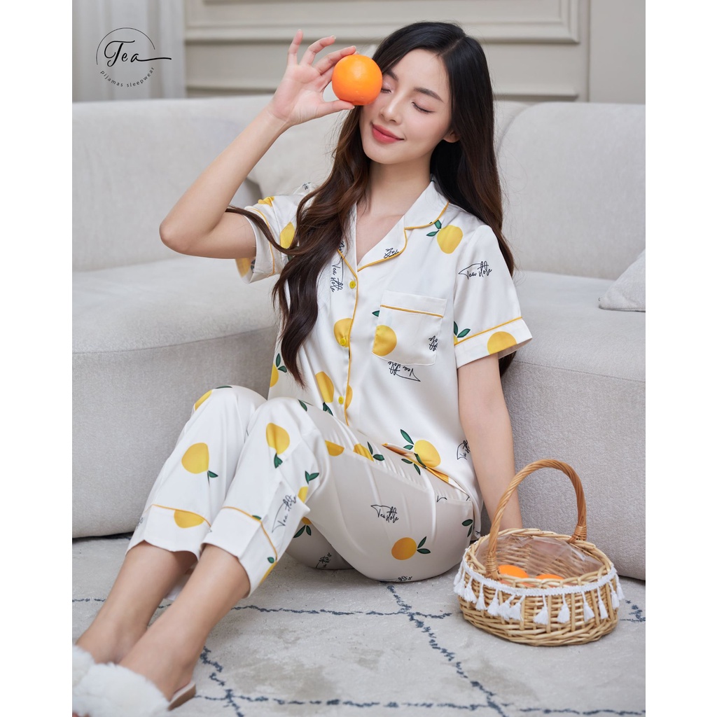 Giới thiệu Bộ mặc nhà Pyjama lụa cao cấp Tea Store tay cộc quần dài họa tiết hoa đỏ