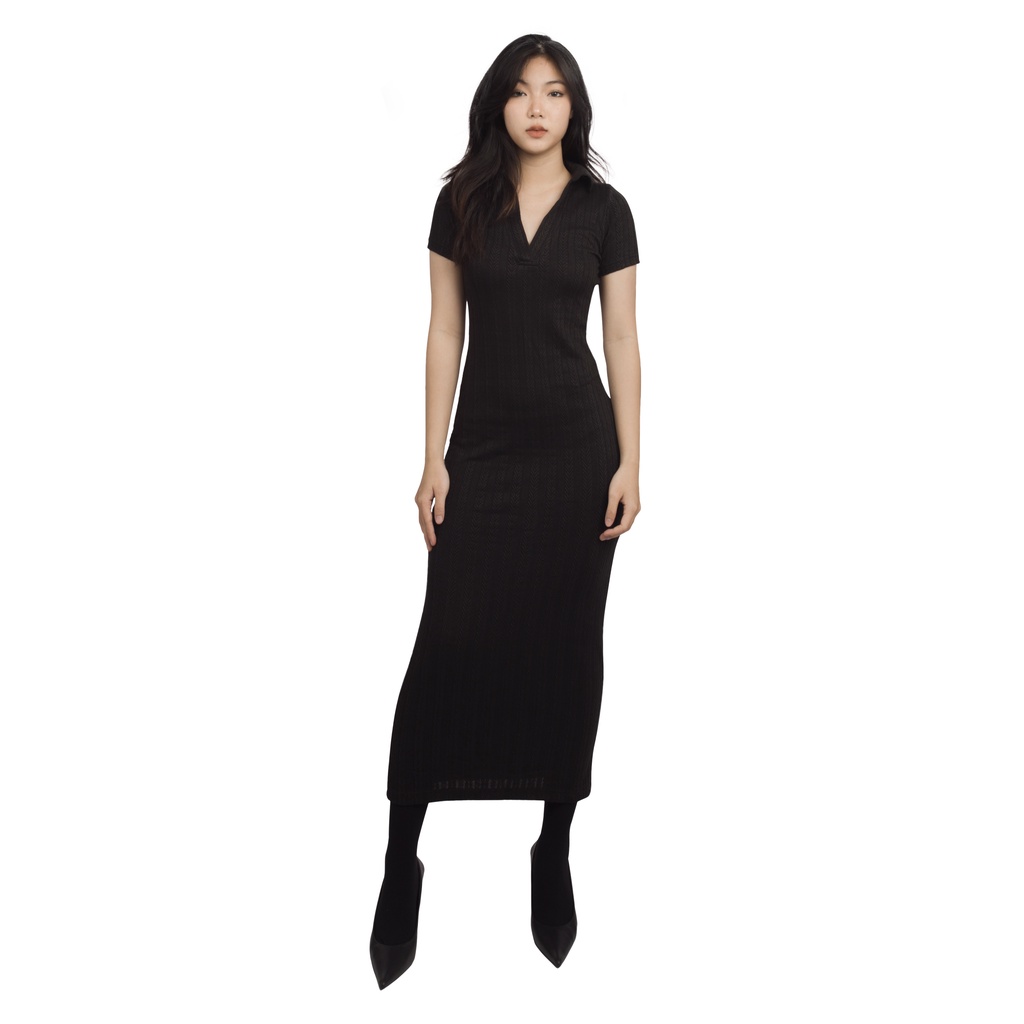 Đầm dài chất liệu thun gân có hoạ tiết, tôn dáng và tạo sự thoải mái. Cổ áo polo - xẻ ngực.