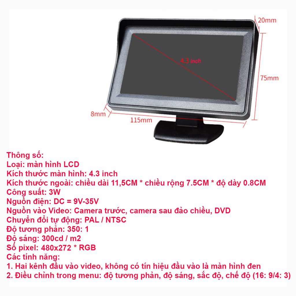 Bộ màn hình và camera lùi, dành cho xe bán tải với dây tín hiệu dài từ 5 mét Camera lùi lắp phía sau xe ô tô, giúp tài xế quan sát phía sau xe khi lùi Màn hình: 4.3 - 5 Inch Độ phân giải: 480*272 Điều chỉnh được độ sáng màn hình 2 đường vào video - có thể lắp 2 mắt camera hoặc camera và DVD Camera có độ phân giải 720P Độ nhạy sáng cao, quay đêm như camera hồng ngoại Tự cân bằng ánh sáng Góc quay 140 độ Vỏ: Nhựa ABS Chống nước IP68 Dây tín hiệu mặc định là 5 mét, nếu quí khách cần dây dài hơn vui lòng liên hệ shop đặt hàng Bộ sản phẩm gồm: Màn hình, camera lùi, dây tín hiệu, dây nguồn Bảo hành 1 tháng, 1 đổi 1 trong thời gian bảo hành 💎Cám ơn Quí khách đã mua sản phẩm của shop, để tránh làm cháy – hỏng sản phẩm vui lòng đấu đúng nguồn điện, hoặc liên hệ với shop để được tư vấn kỹ hơn Shop từ chối bảo hành nếu đấu sai nguồn điện, nhúng trực tiếp sản phẩm xuống nước. Nếu có bất cứ vấn đề gì chưa hài lòng, vui lòng liên hệ shop qua số hotline hoặc qua chat trên shopee. 💎💎Vui lòng đánh giá 5 sao, chụp ảnh cho shop nếu sản phẩm làm hài lòng Quí khách. SHOP CAM KẾT: ✅Hàng giống như trong hình. ✅Giá cả cực kỳ cạnh tranh ✅Giao hàng toàn quốc, thanh toán khi nhận hàng ✅Bảo hành 1 tháng