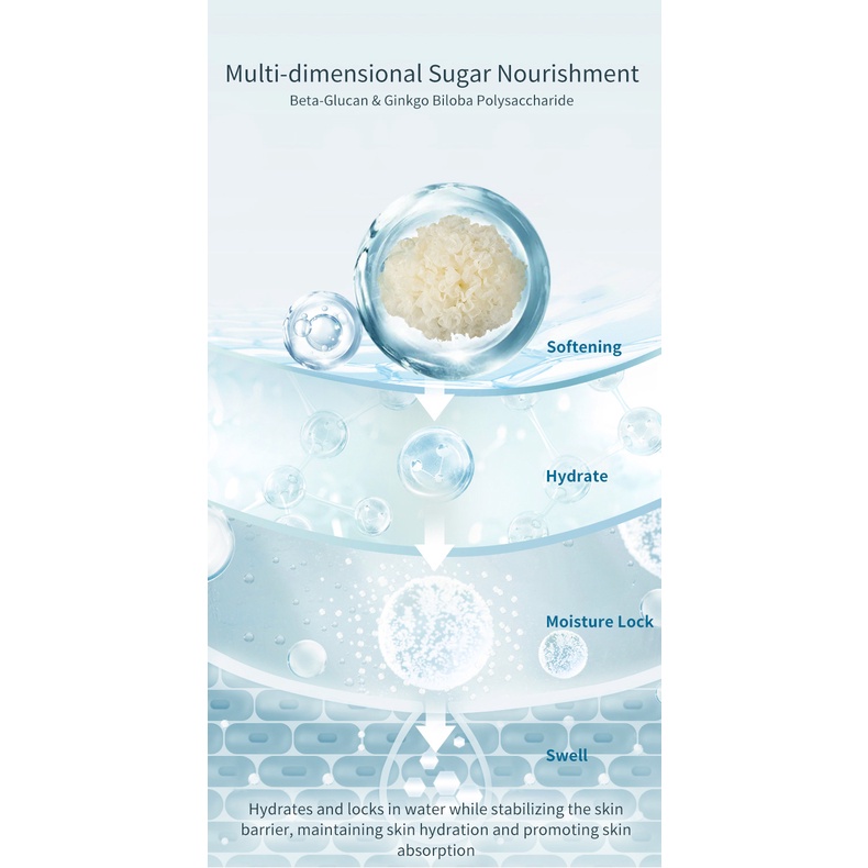 Chiết xuất trái cây Tremella được cấp bằng sáng chế √ Duy trì hiệu quả dưỡng ẩm cho da, thúc đẩy sự hấp thụ và trao đổi chất của da √ Bổ sung và khóa nước đồng thời ổn định hàng rào bảo vệ da √ Các nếp nhăn khô mịn và lâu dài tức thì, giảm lỗ chân lông và cải thiện kết cấu da