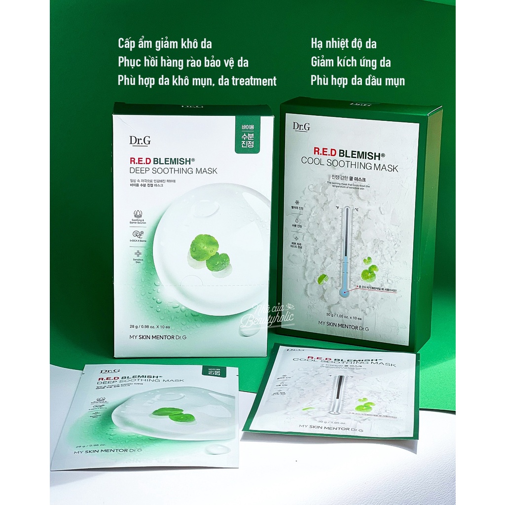 2 chiếc mask giúp hạ hỏa cho da trong những ngày oi nồng đến từ hãng dược mỹ phẩm quốc dân của Hàn: DR.G RED BLEMISH SOOTHING MASK 𝗖𝗢𝗢𝗟 𝗦𝗢𝗢𝗧𝗛𝗜𝗡𝗚 𝗠𝗔𝗦𝗞 với chất mask gel nhẹ, cung cấp độ ẩm vừa đủ cho làn da dầu và hỗn hợp dầu. Công dụng ● Giảm nhiệt tức thì 6 độ C cho da, mang lại cảm giác mát lạnh tức thì ● Giảm s.ưng,giảm v.i.ê.m mụn, tăng sức đề kháng giúp da khỏe mạnh từ sâu các tế bào bên dưới da. ● Cấp ẩm nhẹ nhàng vừa đủ ● Phù hợp cho da dầu mụn, da dầu nhạy cảm kích ứng