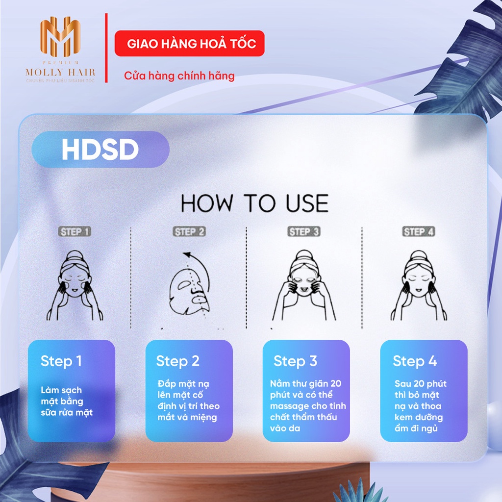 HDSD: Step 1: Làm sạch mặt bằng sửa rửa mặt Step 2: Đắp mặt nạ lên mặt cố định vị trí theo mắt và miệng Step 3: Nằm thư giãn 20 phút và có thể Massage cho tinh chất thẩm thấu vào da