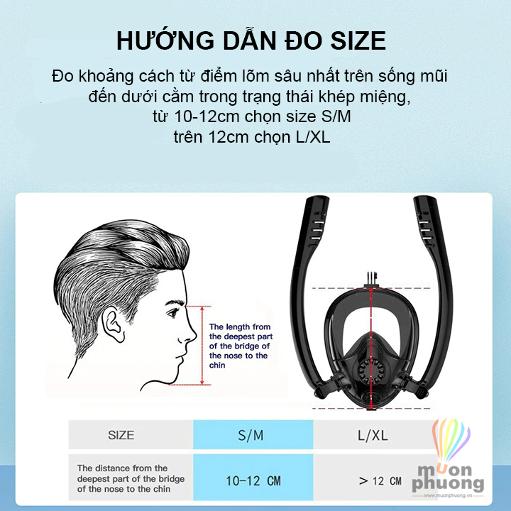 LƯU Ý SỬ DỤNG: - Cách chọn size: vui lòng xem ảnh. - Cách lắp đặt sử dụng: 1. Lắp ống thở và van nổi vào mặt nạ (lưu ý khớp nối chính xác vị trí ngàm và ấn chặt 2 cấu phần lại với nhau), tháo màng bảo vệ ô kính lần đầu sử dụng 2. Điều chỉnh độ dài của dây đeo phù hợp, đeo từ trên xuống dưới, sau đó cân chỉnh cho đến khi cảm thấy thoải mái và an toàn 3. Đặc biệt chú ý: Sau khi đeo mặt nạ không vội vàng nhảy xuống nước, kiểm tra cẩn trọng đảm bảo sản phẩm đã hoạt động tốt trong nước, nếu không an toàn cần kiểm tra lại các bước phía trên 4. Luôn nên có người đi cùng trước khi chìm xuống nước. Trẻ em dưới 12 tuổi nên có sự giám sát của người lớn trong khi sử dụng sản phẩm.