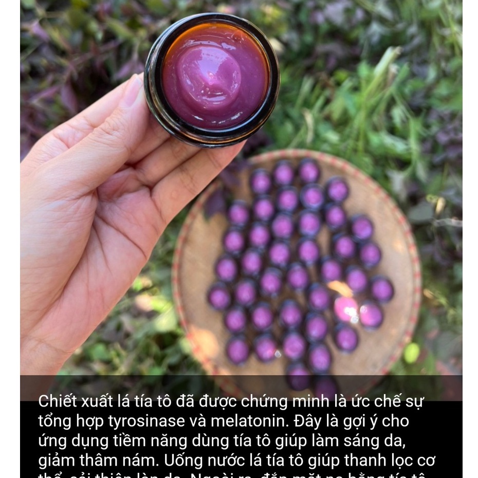 ✅ Mặt nạ tía tô 50g THÀNH PHẦN: Bột Tía tô, Tinh dầu Tía tô, Hydrosol Tía tô, Vitamin E, Vitamin B3,B5, Dầu cám gạo, Dầu Jojoba, Dầu hạnh nhân, Dầu Castor. CÔNG DỤNG: - Giảm thâm, giảm nám, sáng da, giảm m.ụn dưỡng da thuần chay - Cải thiện bề mặt, giúp da trở nên mịn màng - Dưỡng sáng và bổ sung độ ẩm cần thiết cho làn da. - Chống oxy hóa và hạn chế việc sản sinh sắc tố melanin. - Mang lại làn da sáng hồng, đều màu và rạng rỡ. - Mặt nạ Tía Tô có tác dụng mát-xa nhẹ nhàng trong lúc rửa giúp làm sạch da c.hết, mang lại làn da mịn màng, không làm vàng da sau khi sử dụng.