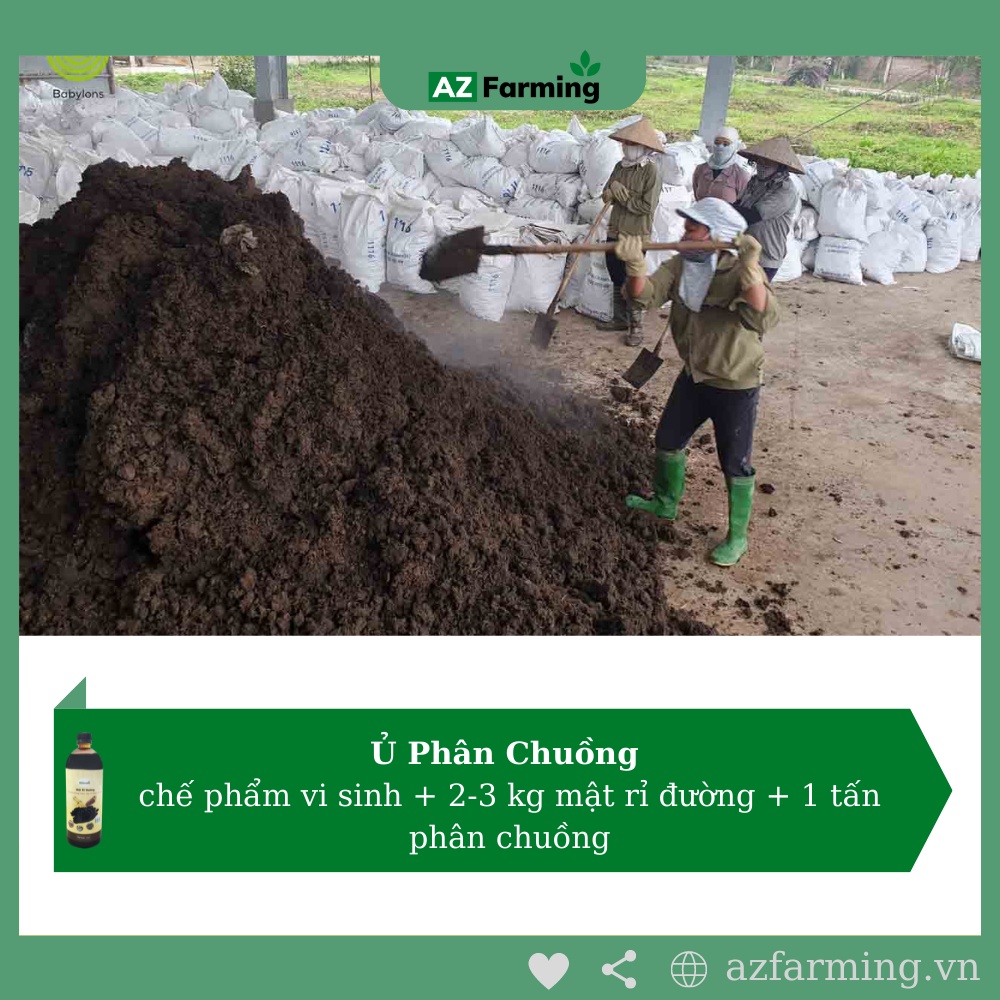 1. Ủ phân chuồng: chế phẩm vi sinh + 2-3 kg mật rỉ đường + 1 tấn phân chuồng.