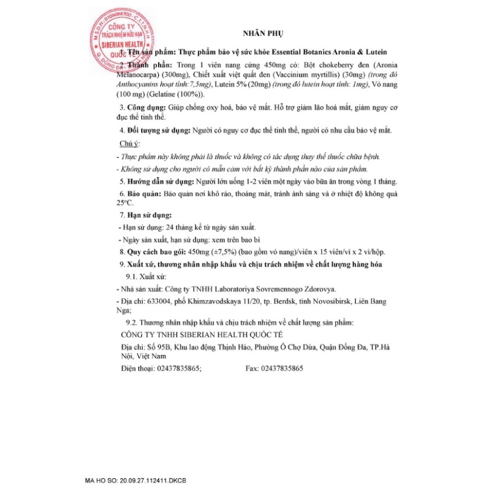 [Hỗ trợ mắt] Thực phẩm bảo vệ sức khỏe Essential Botanics Aronia & Lutein – 30 viên – Date T3/2023 Sản phẩm chứa Lutein và Anthocyanins được chiết xuất từ việt quất đen, kết hợp với bột chokeberry đen, hỗ trợ chống oxy hoá, hỗ trợ bảo vệ mắt. Hỗ trợ giảm lão hoá mắt, hỗ trợ giảm nguy cơ đục thể tinh thể. Thành phần: Trong 1 viên nang cứng 450mg có: Bột chokeberry đen (Aronia Melanocarpa) (300mg), Chiết xuất việt quất đen (Vaccinium myrtillis) (30mg) (trong đó Anthocyanins hoạt tính:7,5mg), Lutein 5% (20mg) (trong đó lutein hoạt tính: 1mg), Vỏ nang (100 mg) (Gelatine (100%)). Công dụng: Sản phẩm chứa Lutein và Anthocyanins được chiết xuất từ việt quất đen, kết hợp với bột chokeberry đen, hỗ trợ chống oxy hoá, hỗ trợ bảo vệ mắt. Hỗ trợ giảm lão hoá mắt, hỗ trợ giảm nguy cơ đục thể tinh thể. Bảo quản: Bảo quản nơi khô ráo, thoáng mát, tránh ánh sáng và ở nhiệt độ không quá 25°C. Cách dùng: Hướng dẫn sử dụng: Người lớn uống 1-2 viên một ngày vào bữa ăn trong vòng 1 tháng. Đối tượng sử dụng: Người có nguy cơ đục thể tinh thể, người có nhu cầu bảo vệ mắt. Xuất xứ: Liên Bang Nga Thương nhân nhập khẩu và chịu trách nhiệm về chất lượng sản phẩm: CÔNG TY TNHH SIBERIAN HEALTH QUỐC TẾ Địa chỉ: Tầng 2, tòa nhà HH-N01 Gold Season, 47 Nguyễn Tuân, Phường Thanh Xuân Trung, Quận Thanh Xuân, Thành phố Hà Nội, Việt Nam. Điện thoại: 0395.796.387 Sản phẩm này không phải là thuốc và không có tác dụng thay thế thuốc chữa bệnh HÃY INBOX NGAY CHO CHÚNG TÔI ĐỂ SỞ HỮU SẢN PHẨM CHĂM SÓC SỨC KHỎE TỐT , DÀNH TẶNG NHỮNG NGƯỜI THÂN YÊU CỦA MÌNH NHÉ ! QUYỀN LỢI CỦA KHÁCH HÀNG khi mua hàng chính hãng tại Shop • Bảo hành trọn đời chất lượng sản phẩm, hỗ trợ đổi trả miễn phí trong 7 ngày (theo chính sách của sàn TMĐT) • Chất lượng sản phẩm được kiểm định kĩ lưỡng trước khi gửi cho Quý khách • Tư vấn hỗ trợ 24/24 giải đáp mọi thắc mắc khi khách hàng gọi vào số hotline hoặc nhắn tin cho Shop • Ấn FOLLOW shop để nhận nhiều ưu đãi ☎ Tư Vấn :. Shop cam kết : 1. 100% sản phẩm chính hãng 2. Giao COD toàn quốc. 3. Đổi trả theo quy định của sàn TMĐT.