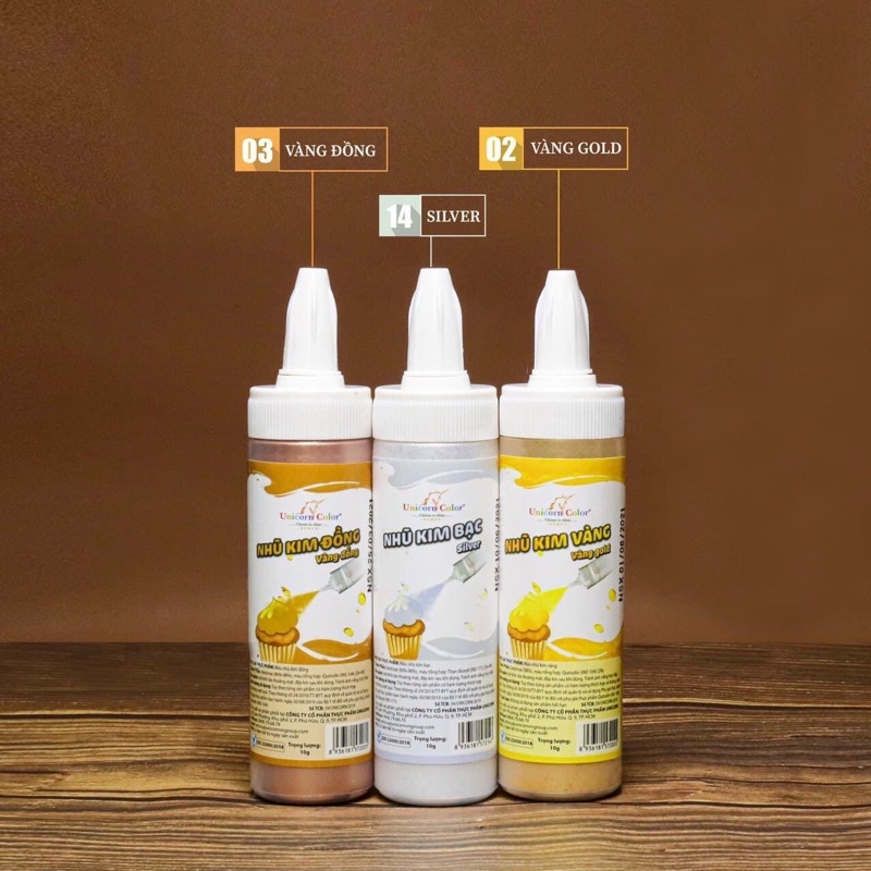Bột nhũ kim 10g: Kim Đồng (Vàng đồng),Kim Bạc (Silver), Kim vàng (Vàng Gold) Ưu điểm: – Bột nhũ kim có màu vàng đồng lấp lánh, sang trọng, bột dạng mịn, đẹp giúp bám đều màu trên bánh và không bị lợn cợn. – Sản phẩm được đóng chai 10g tiết kiệm mà vẫn dùng được lâu. – Bột nhũ kim được thiết kế tiện dụng với đầu nhọn giúp cho việc phun màu dễ dàng. – Sản phẩm được sản xuất an toàn cho sức khỏe người tiêu dùng. Công dụng: Bột nhũ kim màu vàng đồng được dùng trong việc trang trí các loại bánh kem, đặc biệt là bánh kem dạng hũ tiền, đồng bạc,… Cách dùng: Bạn chỉ cần cắt một phần nhỏ đầu nắp lọ để nhũ có thể bay ra. Để cách mặt bánh từ 10 đến 20 cm rồi phun đều, nhẹ lên khu vực bánh cần tạo màu. ---------------- ** Nguyên Liệu -Dụng Cụ Làm Bánh Sỉ Lẻ Cô chủ nhỏ 🚪Địa chỉ: Phan Văn Hớn, P.Tân Thới Nhất, Q.12, TP.Hồ Chí Minh ☎️Hotline: 0934.493.139/ Facebook: https://www.facebook.com/xuan.nguyenthuy.7758/ ⏰Mua hàng trực tiếp tại cửa hàng: Giờ mở cửa: 9:00- 18:00 (T2 - CN)