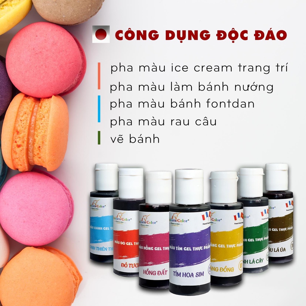 Màu Gel Thực Phẩm : 🍀 Công Dụng: ☑️Tạo màu bạt bánh gato/bánh ngọt. ☑️Kem tươi whipping/topping, kem bơ ☑️Tạo màu cho Socola trắng đun chảy. Và các món ăn, đồ uống khác cần pha màu thực phẩm.