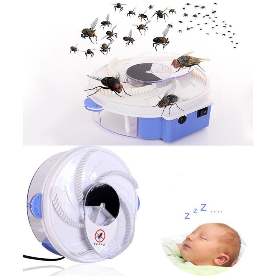 - Hướng dẫn sử dụng máy bắt ruồi thông minh: Bước 1: cho một lượng mồi nhử ruồi (sơ mít, mật ong, thức ăn thừa,..) vừa đủ, không được tràn vào vòng tròn trên đĩa quay. Bước 2: Cắm điện và bật công tắc, máy quay tự động. Bước 3: Sau khi bắt được ruồi, bỏ kẹp tay hai bên đổ ruồi vào túi rác và vệ sinh máy.