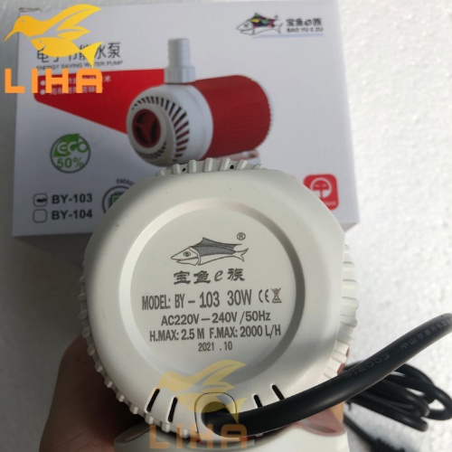 Máy Bơm Bể Cá Baoyu BY103 (30W-2000L/H-2.5M) - Máy Bơm Lọc Nước Cho Hồ Cá - Nguồn điện: 220~240/50Hz - Công Suất: 30w - Lưu lượng tối đa: 2000L/h - Cột áp tối đa 2,5m - Kích thước: 15x8x9cm; - Đầu ra: 16mm- 20mm-22mm-25mm - Ưu điểm: Thông số chính xác, chạy êm và ổn định trong thời gian dài, dễ tháo lắp và bảo trì bảo dưỡng, tương thích với các đường ống có sẵn trên thị trường (zen trên thân máy khớp zen 27 PVC) - Thích hợp sử dụng cho lọc tràn trên bể cá từ 670-1000L - Thích hợp sử dụng cho lọc tràn dưới bể công nghệ 80-120cm - Thích hợp chế hút mặt hút đáy bơm lên lọc thùng nổi cho các hồ non bộ tiểu cảnh 700-1300L. - Thường sử dụng để chế lọc thùng - lọc ngoài. - Thường sử dụng cho Aquaponic. - Thường sử dụng để bơm các thác non bộ tiểu cảnh nhỏ. - Sử dụng được cho cả bể nước mặn và nước ngọt. Quý khách cần lưu ý - Vệ sinh bảo trì thường xuyên để đảm bảo hiệu quả và tuổi thọ sản phẩm. Nên vệ sinh 2 tháng 1 lần. - Ngắt điện thiết bị khi thực hiện vệ sinh bảo trì thiết bị hay thao tác trong bể cá.