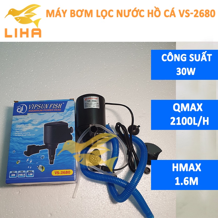 Máy bơm lọc nước hồ cá cảnh 30W VIPSUN VS-2680 là loại thiết bị chuyên dùng để lọc nước cho hồ bể cá cảnh của bạn luôn luôn sạch. Đây cũng là 1 trong những loại đơn giản, giá thành rẻ, được sử dụng phổ biến nhiều nhất hiện nay. Đặc điểm: đây là lọc cơ học, máy bơm hút nước từ bể lên trên hộp lọc, trong hộp lọc có lớp bông, những cặn bã, tạp chất lơ lững trong nước, phân cá… sẽ được giữ lại bởi lớp bông này, giúp nước hồ cá luôn trong sạch. Xuất xứ: Trung Quốc Kích thước hộp sản phẩm: 14 x 18 x 7 cm Trọng lượng: 600 gram. Thông số kỹ thuật Máy bơm lọc nước: – Model: VS-2680 – Xuất xứ: Trung Quốc VIPSUN FISH – Lưu lượng nước: 2100 L/H – Đẩy cao: 1.6 M – Công suất: 30W