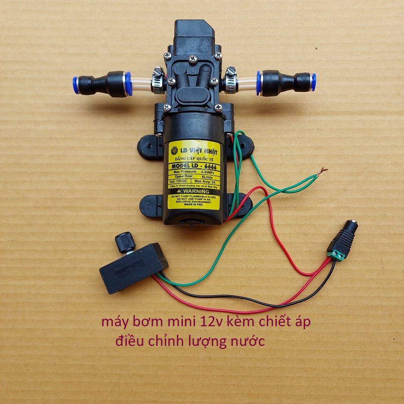 MÔ TẢ SẢN PHẨM ....lưu ý ; bơm 12v có thể thay đổi mẫu mã theo đợt,mà không cần báo trước Máy bơm mini 12v + 2 đầu chuyển ống 8mm Điện áp: DC 12V Áp lực tối đa: 0.95Mpa Tự động ngắt mở Cột áp ( trong đường ống ): cao 4-5 mét Nhiệt độ tối đa: 55 độ C Lưu lượng nước: 8L/ phút Vỏ bên ngoài: nhựa ABS Lõi Motor: Đồng Loại động cơ: chổi than máy bơm mini 12v là lựa chọn hoàn toàn đáp ứng được nhu cầu của bạn để phun sương, phun t.huốcsâu, phun tưới lan, tưới nhỏ giọt, bơm nước và các nhu cầu khác.