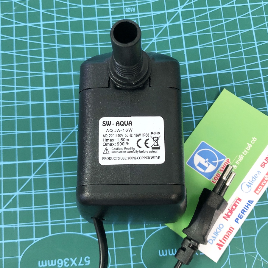 MÁY BƠM TIỂU CẢNH, BỂ CÁ SW-AQUA 16W - Voltage: 220v - 240v/50Hz - Power: 16w - Hmax: 1.6m - Qmax: 900L/h - Có núm vặn cơ điều chỉnh lưu lượng CÔNG DỤNG - Dùng làm bơm thác cho tiểu cảnh, bơm lọc cho bể cá, bể thủy sinh.....