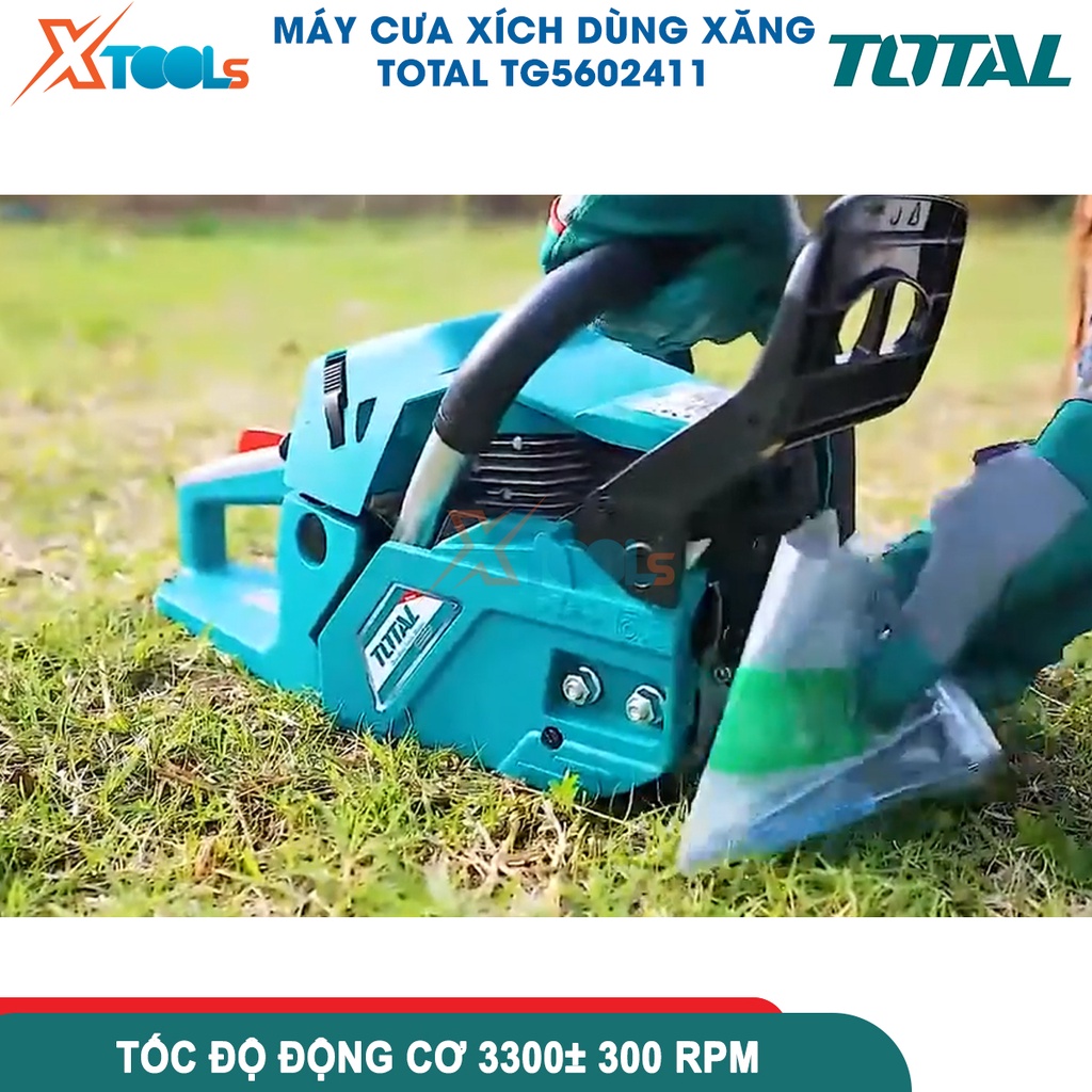 Máy cưa xích dùng xăng Total TG5602411 là một loại máy cưa cầm tay chạy bằng xăng có thể cưa cắt nhờ vào các răng cưa sắc bén được bố trí đều nhau trên một dây xích. Khi dây cưa xích quay dọc trên một thanh dẫn (lam), những tấm gỗ lớn sẽ được các lưỡi răng cưa nhanh chóng cắt đứt mà không cần tốn nhiều sức.