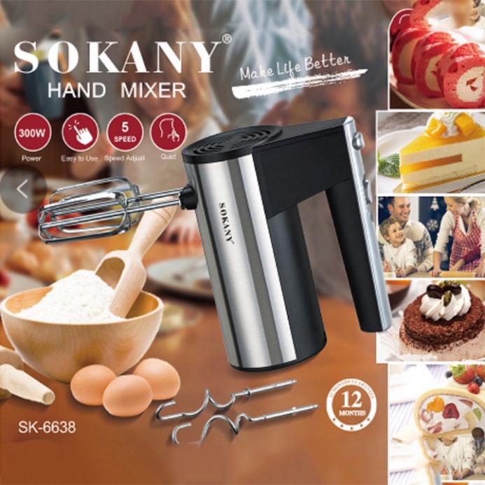 ⛵ MÁY ĐÁNH TRỨNG VÀ TRỘN BỘT SOKANY THÔNG SỐ KỸ THUẬT: + Thương hiệu: Sokany + Điện áp: 220V/50Hz + Công suất: 300W + Chất liệu: Nhựa cao cấp, thép không gỉ + Điều chỉnh 5 tốc độ phù hợp với từng loại thực phẩm và nhu cầu sử dụng + Đầu đánh trứng và móc trộn inox Giới thiệu sản phẩm Máy đánh trứng, trộn bột là một trong những thiết bị không thể thiếu trong các cửa hàng làm làm bánh, từ bánh mì, bánh ngọt, bánh sinh nhật đến cả pizza. Đặc điểm sản phẩm - Chất liệu động cơ bánh răng fiber glass giúp hoạt động bền bỉ - Nâng cao tuổi thọ gấp 4 lần chiếc máy đời cũ - Đáp ứng nhiều loại nhu cầu sử dụng lên đến 5 mức độ - Hoạt động dễ dàng với thiết kế đơn giản nút mở nắp và nút xoay mức độ. ⛵