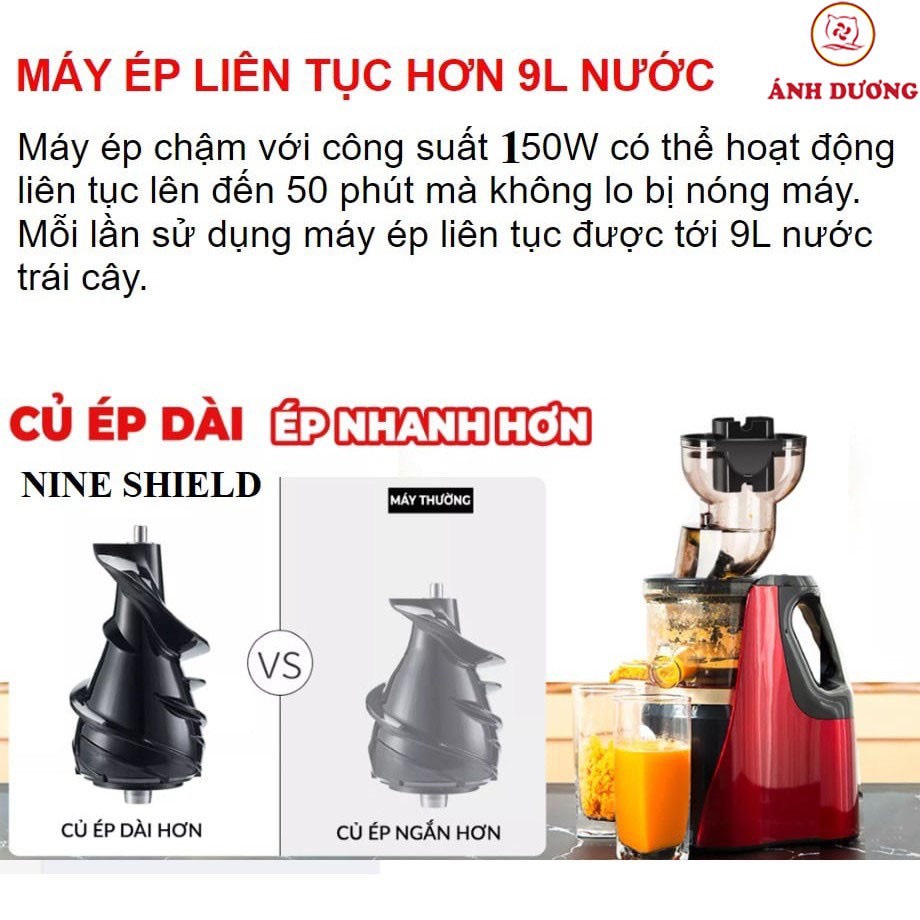 Máy Ép Chậm Nineshield - Ép Kiệt Bã - Máy Ép Trái Cây Tốc Độ Chậm-Gia Dụng Gia Đình 💘 CAM KẾT: - GIAO HÀNG TOÀN QUỐC - GIAO HÀNG HỎA TỐC NHANH - DÙNG CẢ TẤM LÒNG TƯ VẤN KHÁCH HÀNG - XỬ LÝ VẤN ĐỀ HÀNG TRONG 30' SAU KHI QUÝ KHÁCH NHẬN HÀNG - Kiểm tra chất lượng sản phẩm chặt chẽ trước khi giao hàng. - Đóng gói tiêu chuẩn đảm bảo sản phẩm nguyên mới 100% về đến tay khách hàng. - Giao hàng nhanh chóng và thu tiền tại nhà khi nhận hàng (COD). - Bảo hành sản phẩm 12 tháng. - Đổi trả trong vòng 5 ngày nếu do lỗi của nhà sản xuất ☎ 0942151280 🏡 CS1: Số 9a Ngõ 181 Xuân Thuỷ - Dịch Vọng Hậu - Cầu Giấy - Hà Nội CS2: 165 Dương Quảng Hàm - Quan Hoa - Cầu Giấy - Hà Nội\