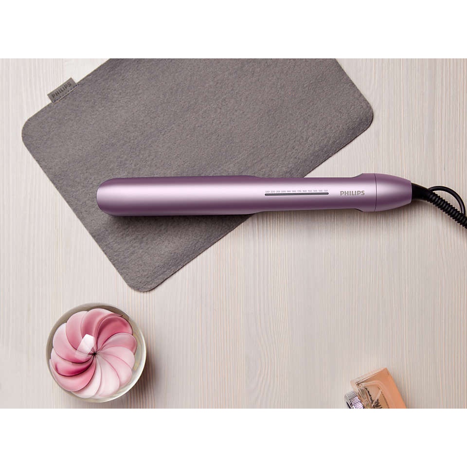 MÔ TẢ SẢN PHẨM: Công nghệ ThermoShield bảo vệ tóc ít bị hư tổn hơn do nhiệt Các tấm kẹp trơn giúp máy ép tóc trượt dễ dàng qua tóc, nhờ vậy bạn có thể tiết kiệm thời gian tạo kiểu và có được một mái tóc thẳng mượt lâu hơn. Các tấm kẹp uốn cong được làm bằng gốm cải tiến sẽ di chuyển để điều chỉnh áp lực lên tóc, đảm bảo phân phối nhiệt và áp lực đồng đều trên tóc để tạo kiểu tóc đẹp. Chăm sóc ion gấp 2 lần*** cho mái tóc bóng mượt, không quăn rối Các tấm kẹp làm bằng gốm được tẩm dầu argan, dễ trượt trên tóc Bạn có thể tạo mọi kiểu tóc yêu thích từ kiểu tóc thẳng bóng mượt và sang trọng cho đến những lọn tóc xoăn bồng bềnh, hay những lọn tóc rẽ ngôi. Phạm vi nhiệt độ từ 120°C đến 230°C để cố định kiểu tóc bền lâu, đồng thời giảm thiểu nguy cơ hư tổn tóc. Các tấm kẹp 105 mm dài hơn cho phép tiếp xúc tốt hơn với tóc, giúp bạn có được mái tóc thẳng hoàn hảo dễ dàng hơn và trong thời gian ngắn hơn. Đầu mát giúp sử dụng dễ dàng và an toàn hơn Máy đi kèm tấm lót cuộn chịu nhiệt để bạn dễ dàng bảo quản máy trên bàn, trong ngăn tủ hoặc mang theo tạo kiểu tóc khi đi du lịch.