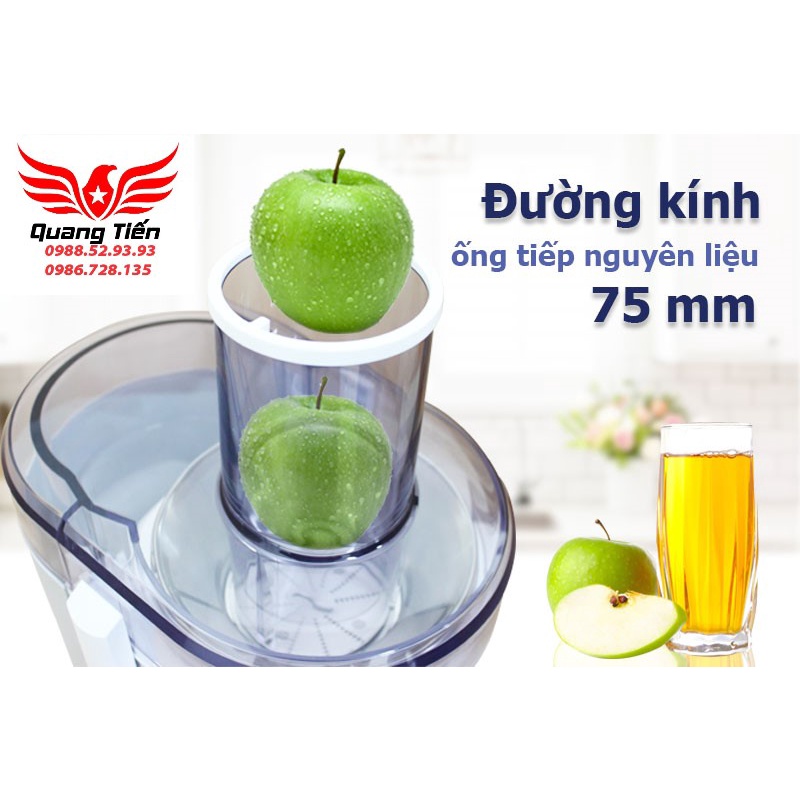 Máy ép trái cây có ống tiếp nguyên liệu có đường kính lớn giúp bạn ép trái cây mà không cần cắt nhỏ Bạn có thể ép nguyên trái đối với các loại củ quả cỡ vừa và nhỏ, từ đó tiết kiệm được nhiều thời gian và công sức. Chỉ cần nâng vòi lên sau khi dùng để ngăn nước ép nhỏ giọt xuống bàn