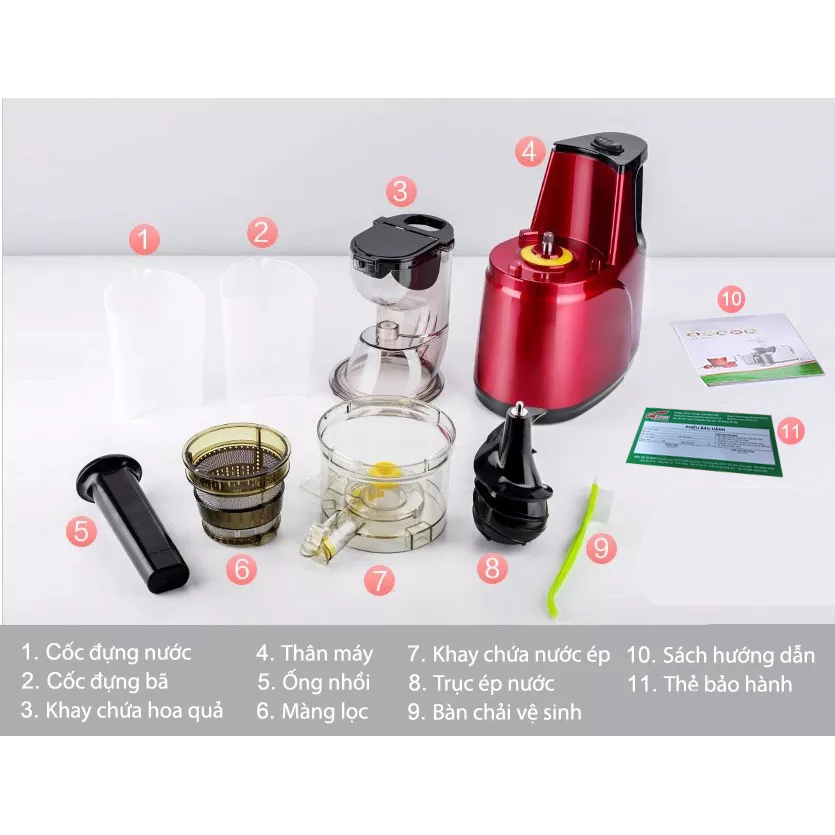 Thông Tin Sản Phẩm Máy Ép Trái Cây Tốc Độ Chậm SKG SK-68: – Tên sản phẩm: Máy Ép Hoa Quả Tốc Độ Chậm SKG – Model: SK-68 – Nguồn điện: 220 –240V, 50Hz, Công Suất: 150W. – Chuyển động: 45 Vòng/ 1 phút – Trọng lượng trọn bộ: 3.8 Kg. – Kích thước vỏ hộp: 23cm x 14cm x 43cm – Xuất xứ: Chính Hãng SKG. – Bình chứa dung tích:1lít. – Bảo hành: 12 tháng chính hãng, lỗi 1 đổi 1. --------------------------------------------------------------- ƯU ĐIỂM : – Ép nước cam, chanh, bưởi thật dễ dàng, thơm ngon, an toàn tuyệt đối. – Ép nho tươi đến kiệt bã, không lẫn cặn. – Ép sữa ngô đơn giản và đảm bảo độ thơm ngon. – Ép rau, Củ, Quả rất nhẹ và đẹp mắt. – Làm Đậu Hũ rất dễ dàng từ Máy Ép tốc độ chậm SKG SK-68 --------------------------------------------------------------- CHẾ ĐỘ BẢO HÀNH KHI MUA MÁY ÉP TRÁI CÂY TỐC ĐỘ CHẬM SKG SK-68 TẠI TBMART: TẠI SAO BẠN NÊN MUA HÀNG CỦA CHÚNG TÔI BỞI: – Cam kết Bảo Hành 12 Tháng (Chỉ chúng tôi mới bảo hành lâu đến vậy) – Lỗi 1 đổi 1 – Hoàn tiền ngay 100% (với lỗi do nhà sản xuất) – Tất cả các chính sách trên đều được bảo hành bằng Phiếu và ghi đầy đủ nội dung được bảo hành nên khách hàng mua tại TBMART càng có cơ sở để yên tâm mua sắm !
