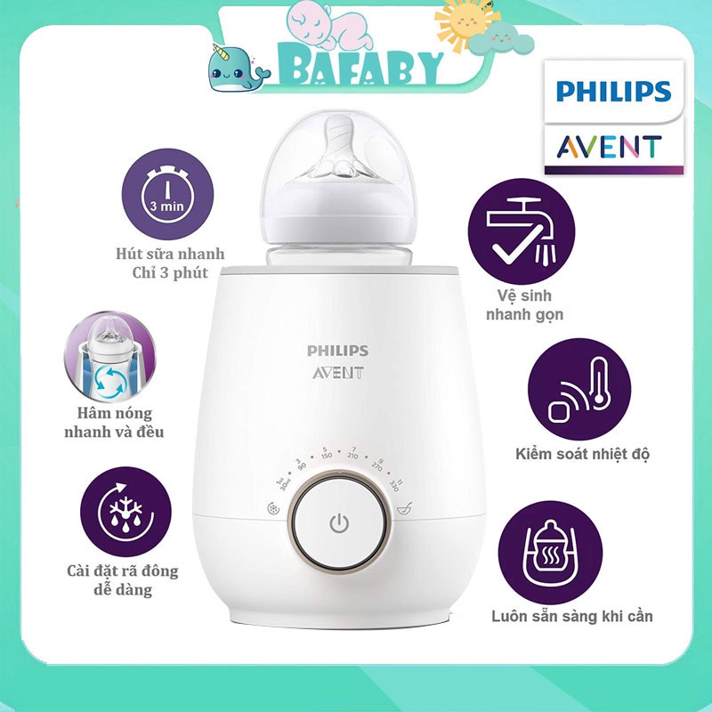 * Điểm nổi bật của máy hâm sữa: - Hâm nóng nhanh và dễ dàng - Chỉ mất chưa tới 3 phút* - Hâm nóng đều - Hâm nóng nhanh chóng - Rã đông nhanh chóng - Hâm nóng thức ăn cho bé - Kiểm soát nhiệt độ thông minh giúp hâm nóng đến nhiệt độ lý tưởng - Bạn chỉ cần cài đặt lượng sữa, nhấn nút khởi động, phần việc còn lại đã có chức năng kiểm soát nhiệt độ thông minh giúp bạn. Chức năng này sẽ kiểm tra nhiệt độ ban đầu của sữa, sau đó nhanh chóng hâm nóng đến nhiệt độ lý tưởng và giữ ấm ở nhiệt độ này trong tối đa 60 phút.