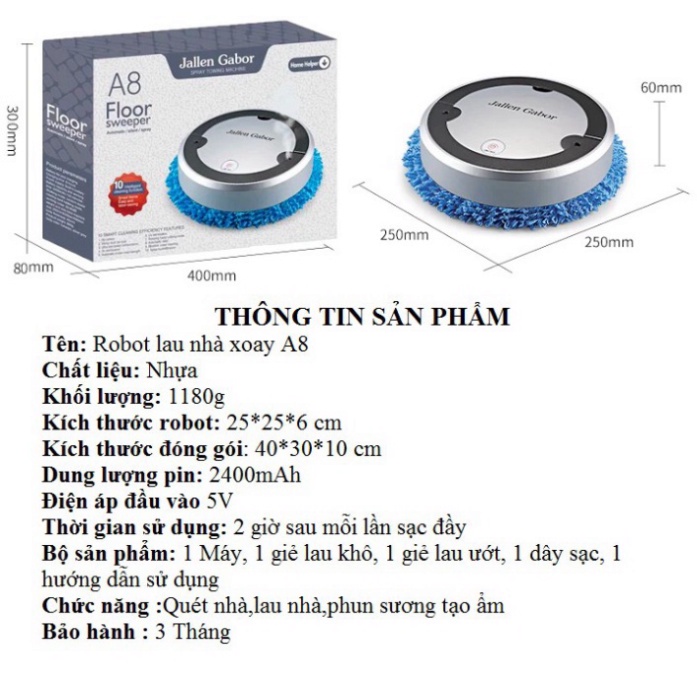 ✨ Đặc Điểm Nổi Bật ✨ - Hoạt động xoay tròn, tao ra lực mạnh hơn, làm sạch hơn với diện tích lớn hơn - Tiếng ồn thấp - Không cần điều chỉnh cài đặt kiểm soát, máy tự hoạt động - Tiêu thụ điện năng thấp, tiết kiệm điện - Giẻ lau khô và giẻ lau ướt dễ dàng thay đổi phù hợp với trạng thái sàn nhà - Robot xoay mô phỏng bàn tay người, làm sạch hiệu quả - Làm sạch được nhiều loại sàn nhà với các loại bụi, lông tóc, vết bẩn... - Chế độ phun sương cân bằng độ ẩm, mọi lúc mọi nơi robot đi qua - Robot gặp vật cản tự động chuyển hướng, làm việc chăm chỉ và hiệu quả hơn - Mỗi lần sạc đầy pin sử dụng được 2 giờ với dung lượng pin lớn