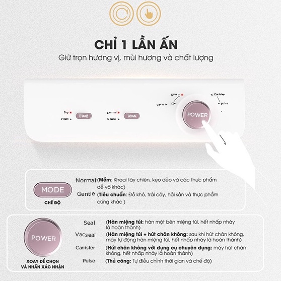 ✔️ Thích hợp bảo quản với các loại thực phẩm khô, ướt, mềm, bột.. Các bước hút chân không thực phẩm với máy hút chân không Bear VS-B01V1 (FKJ-A01F1) - Bước 1: Cho thực phẩm cần hút chân không vào túi hút chân không. - Bước 2: Mở máy bằng cách ấn 2 nút bên cạnh của máy. Đặt miệng túi vào khoang hút chân không. - Bước 3: Đóng nắp máy bằng cách ấn mạnh tay vào phía trên nắp (vị trí có hình bàn tay). - Bước 4: Xoay núm "Power" (nguồn) chọn chế độ VacSeal (hút chân không + hàn miệng túi) - Bước 5: Ấn nút "Power" để xác nhận hàn và hút chân không đồng thời. Khi hàn xong máy sẽ tự động thả mối hàn và phát ra tếng bíp kết thúc. - Bước 6: Ấn mở nắp máy ở 2 bên cạnh máy và kiểm tra mối hàn. Tương tự với cách thức như trên, chỉ cần xoay núm "Power" để đổi chế độ sử dụng máy.