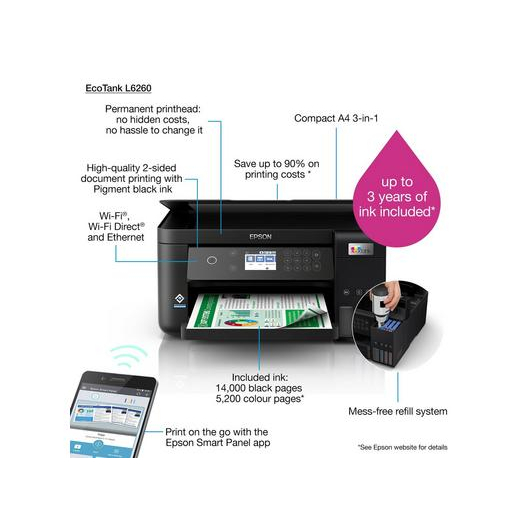 ✨ Kết nối đa phương tiện, sử dụng nhanh chóng, dễ dàng Máy in Epson Ecotank L6260 được tích hợp khả năng kết nối không dây qua Wi-Fi và kết nối mạng LAN nội bộ phổ biến hiện nay. Qua đó, cung cấp khả năng kết nối với nhiều thiết bị hiện đại như máy tính để bàn, máy tính xách tay, điện thoại di động, máy tính bảng, iPad. Tính năng này đảm bảo kết nối và làm việc mọi lúc, mọi nơi, theo yêu cầu, giúp giảm chi phí đầu tư thiết bị cho các doanh nghiệp trong ngành, mang lại lợi ích lớn hơn với chi phí thấp hơn.