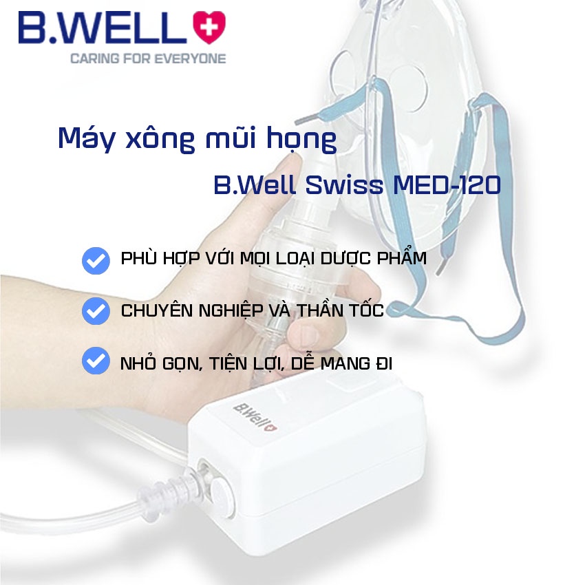 THÔNG TIN về máy xông mũi họng B.Well Swiss B.Well Swiss MED-120 là thiết bị xông mũi họng thế hệ mới, được nhập khẩu 100% từ Thụy Sĩ. Chất lượng sản phẩm đáp ứng theo tiêu chuẩn châu u EN-13544. B.Well Swiss MED-120 là một trong số những thiết bị hỗ trợ điều trị đường hô hấp dưới hiệu quả nhất hiện nay. Bộ sản phẩm có kích thước nhỏ gọn (110x62x35cm) thuận tiện cho việc sử dụng và mang theo bên mình. Máy xông