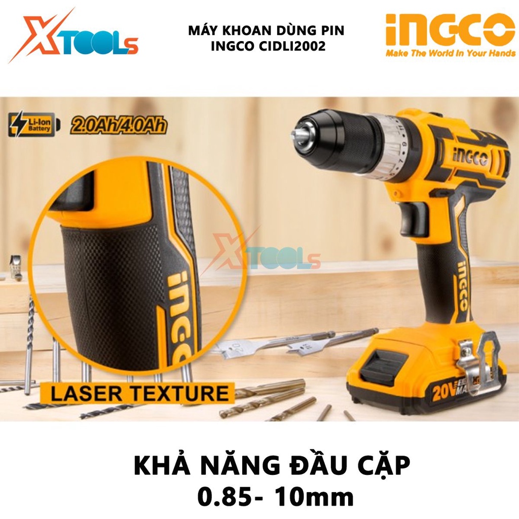 Dụng cụ và thiết bị tiện ích > Dụng cụ cầm tay > Máy khoan, máy vặn vít & phụ kiện > Máy khoan bê tông dùng pin 20V Ingco CIDLI2002 nhông hai tốc độ, khả năng khoan 0.85- 10mm, đầu khoan khóa tự động, nhôn