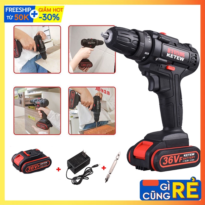 ⛵ Máy khoan pin được trang bị động cơ cực khỏe đặc biệt có chế độ khoan búa nên có thể khoan mọi bề mặt: khoan gỗ, khoan tường, khoan bê tông, khoan kim loại,... DUNG LƯỢNG PIN CỰC KHỦNG: Pin của máy khoan pin được cải tiến với công nghệ sạc nhanh, và cải thiện được thời gian sử dụng lên nhiều giờ đồng hồ. 1. THÔNG SỐ KỸ THUẬT CƠ BẢN KHOAN 36V 1PIN + Thương hiệu: KETEW + Mô men xoắn cực đại :32Nm + Tốc độ không tải 0-2350v/phút ở chế độ không tải + Đầu cặp nhanh :10mm + Đèn Led : CÓ + Đảo Chiều : CÓ + Giảm Tốc : CÓ THIẾT KẾ PHÙ HỢP: Thân máy khoan được làm từ chất liệu cao cấp, đầu khoan bọc thép ==>> kéo dài độ bền, cũng như hạn chế va chạn đến động cơ máy khoan bên trong. Vỏ ngoài Máy được làm bằng nhựa và tay cầm được bọc một lớp cao su tạo độ nhám cao giúp chống trượt, chịu nhiệt và cách điện. Thiết kế này vừa tạo cảm giác chắc chắn, êm tay, vừa đảm bảo an toàn cho bạn kể cả khi bị ra mồ hôi tay hay tay bạn đang bị dính dầu nhớt trong lúc làm việc. + Bộ sản phẩm gồm - 1 máy khoan - 1 dây sạc - 1 PIN - 1 đầu văn vít ⛵