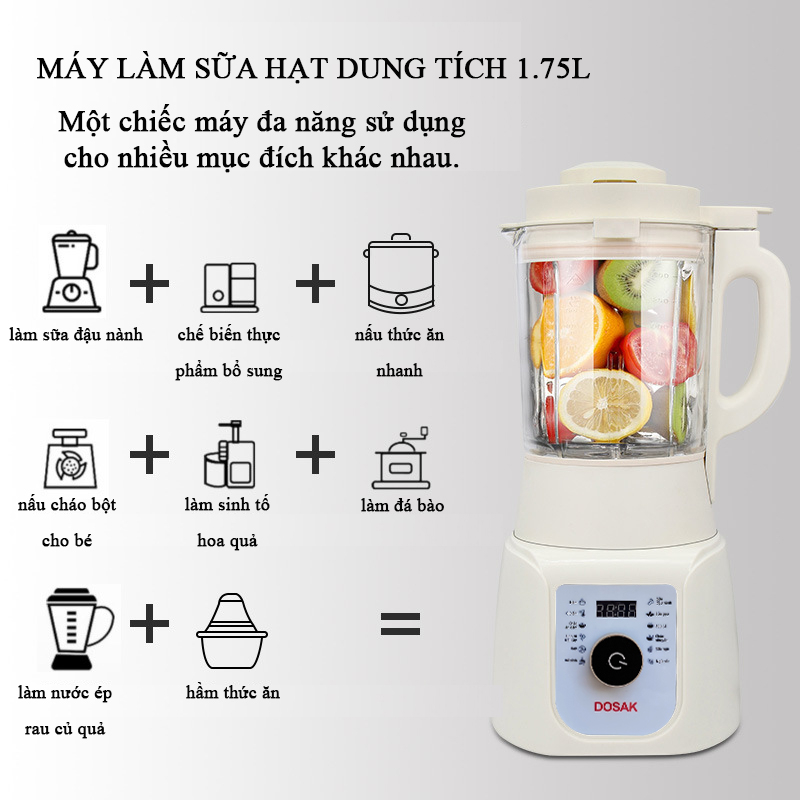 Máy làm sữa hạt mini Dosak dung tích 1.75L dùng cho cả gia đình, máy nấu sữa hạt nấu cháo bột, máy xay sinh tố, làm ấm tự động, hẹn giờ, tự động làm sạch,