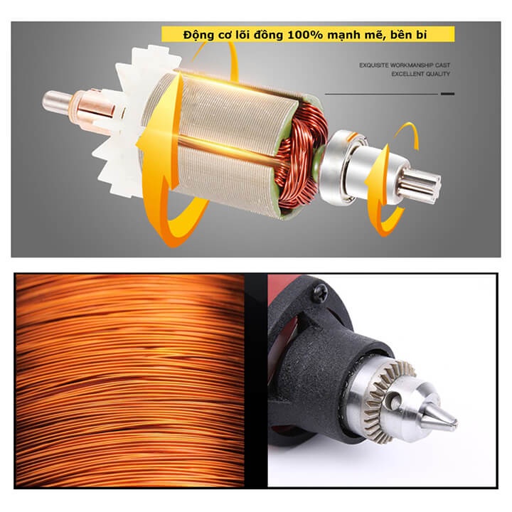 Giới thiệu về sản phẩm: - Công dụng: dùng để mài, khoan, cắt, điêu khắc, làm lũa gỗ, đánh bóng, chà nhám... các chi tiết nhỏ trên gỗ, kim loại,... - Máy sử dụng ruột lõi ĐỒNG 100%, hoạt động mạnh và ổn định, tiết kiệm điện. - Thiết kế máy nhỏ gọn, dễ dàng thao tác với nhưng chi tiết nhỏ, ở nhưng vị trí chật hẹp. - Máy sử dụng trực tiếp nguồn điện 220v nên tiện dụng, không cần dụng cụ chuyển đổi phức tạp. - Máy có 6 tốc độ điều chỉnh với vòng tua tối đa đến 32000 vòng/phút, phù hợp với nhiều công việc khác nhau.