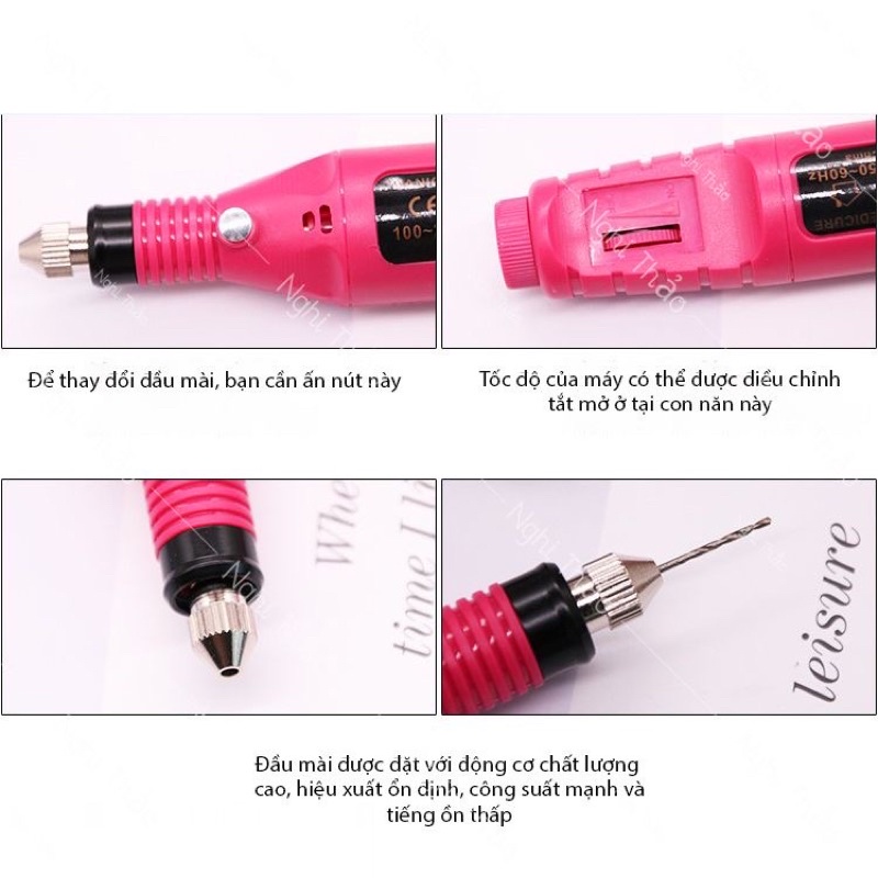 Lưu ý: - Sử dụng máy ở tốc độ cao có thể làm tổn thương tay - Đầu mài đi kèm là đầu mài cơ bản , chỉ đáp ứng được các yêu cầu cơ bản khi làm nail
